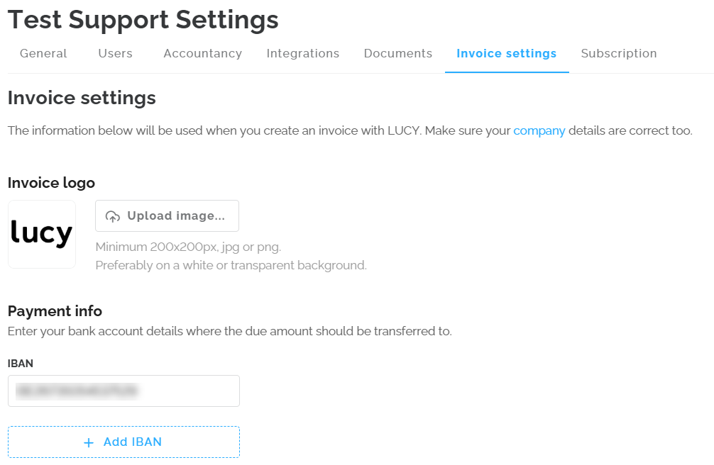 Important: Ensure that the following fields are completed, as they are mandatory: IBAN, invoice numbering, the email address where customers can respond. If these fields are not filled in, the settings cannot be saved.