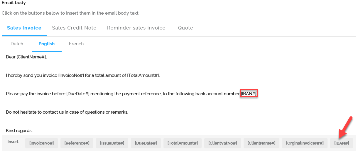Important: Use the tag [IBAN#] in your email template to automatically display bank account numbers according to your settings.