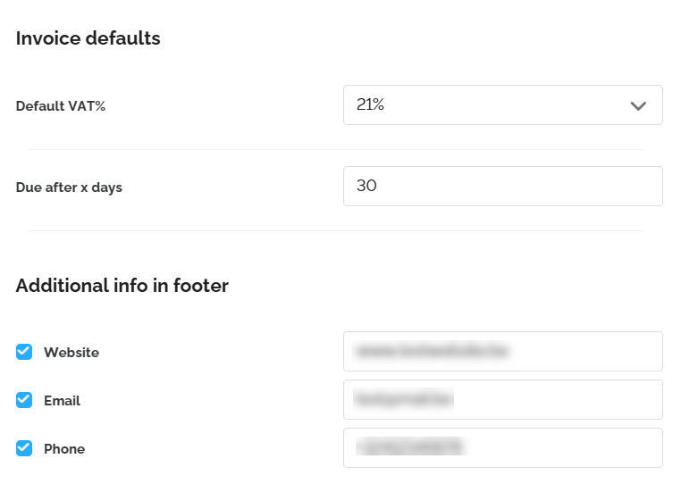 You can set the default VAT rate and default due date. You can also add additional information for the footer, such as your website, email address, and phone number. Currently, the additional footer information is only displayed in template 1.