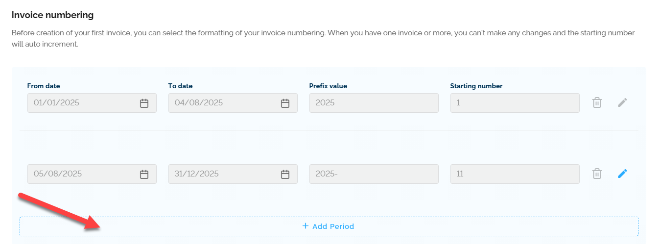 If you want to change the invoice numbering, you can add a new period with the desired numbering. It’s important to assign the correct invoice date to ensure that the proper numbering sequence is applied.