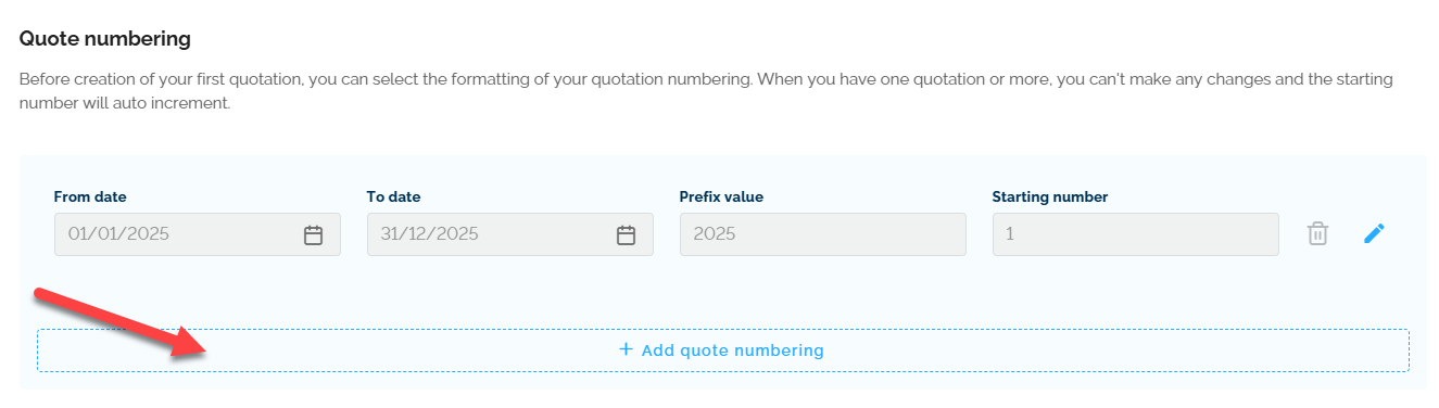 You can also set up the numbering for quotations. As with invoices, the numbering cannot be changed once the first quotation has been created. You can use periods to adjust the numbering or restart it at the beginning of a new fiscal year.