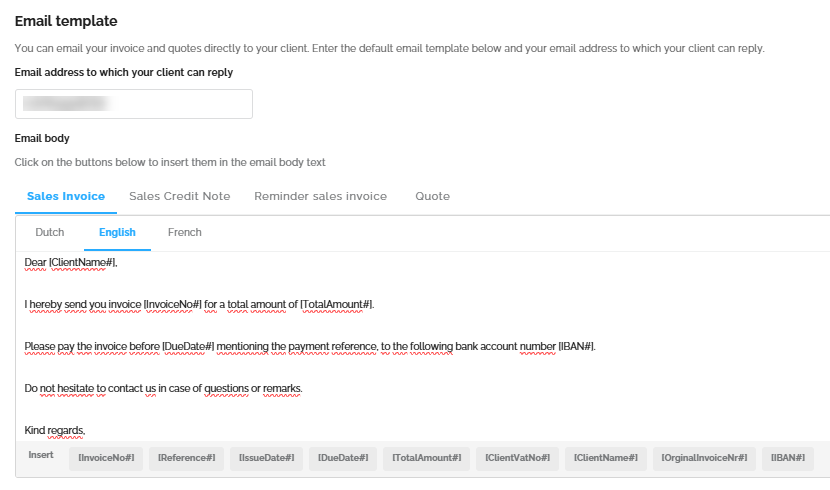 Under the email template section, you can enter your own email address where customers can reply. In addition, you can customize the email text and add extra information for sales invoices, sales credit notes, reminders, and quotations. The email sent to the customer will be sent in the customer’s language.