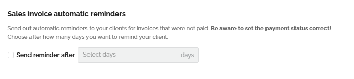 You can send automatic reminders to your customers by enabling this option and setting after how many days the reminder should be sent. It is important to manually ensure that the payment status of the invoices is updated correctly. Note: The days must be selected in this field and should not be entered manually.