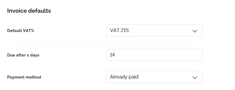 You can set the VAT percentage, due date, and payment method as default values. These settings will be automatically applied to every invoice you create.