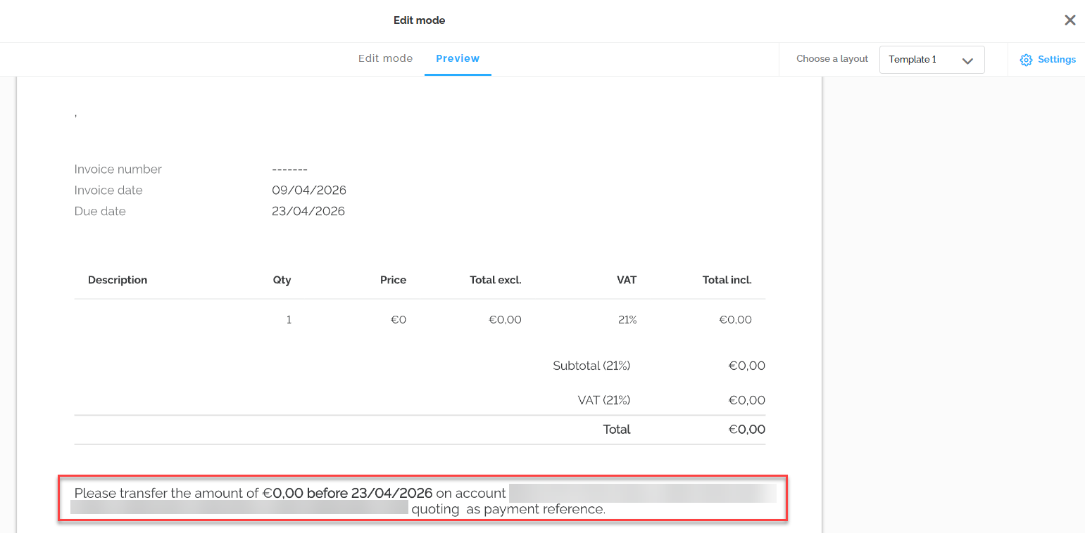 - 'Credit transfer' method: If you choose this option, a payment request will automatically be placed on the invoice. This contains all the details the customer needs to complete the payment via bank transfer.