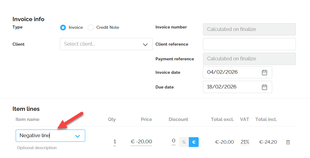 Important: The following functionalities are currently not possible in Lucy. We are exploring how to make this possible in the software in the future: It is not possible to mark an invoice as paid in Lucy. However, this can be indicated in the additional notes field at the bottom of the invoice. It is not possible to add a negative line to your invoice. However, you can create an item with a negative amount and add it to the invoice.It is not possible to enter prices including VAT. Item prices must be entered excluding VAT, after which Lucy automatically calculates the VAT. Is is not possible to send a Peppol invoice to you customer's GLN number.