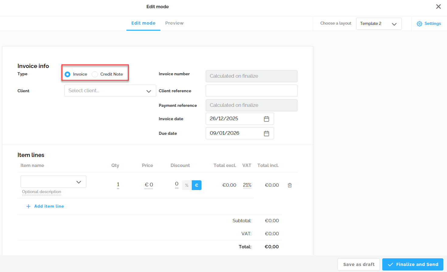 From the Invoices overview, you can click the ‘New invoice’ button to create an invoice or a credit note.