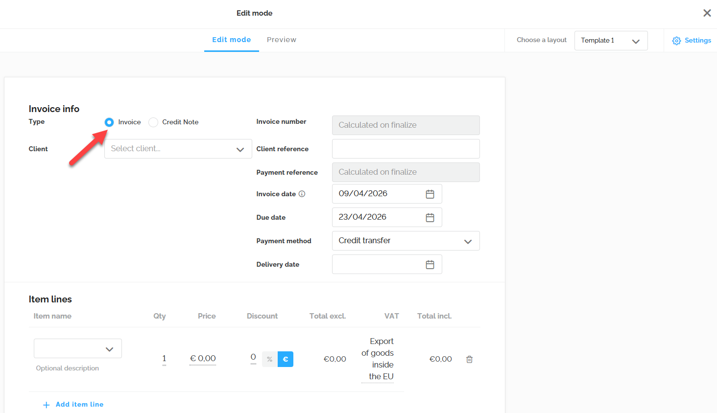 Important: The invoice number and payment reference only appear on the finalized invoice. The same goes for the QR code, which is automatically added when the invoice is completed. You do not need to add the QR code yourself, and it cannot be omitted.