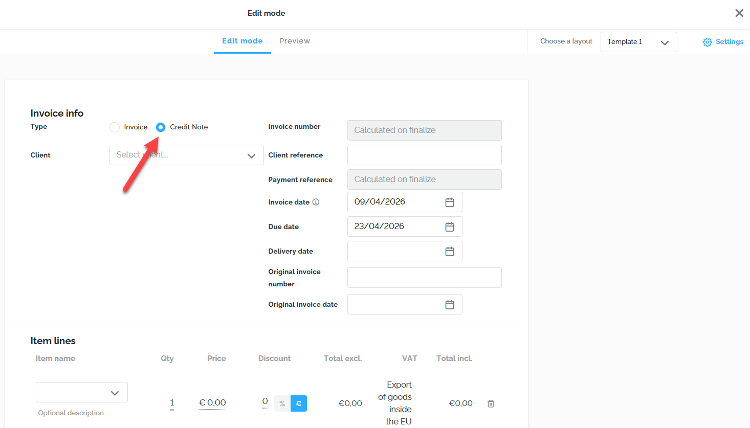 Once the invoice or credit note is ready, you can save it as a draft or finalize and send it.