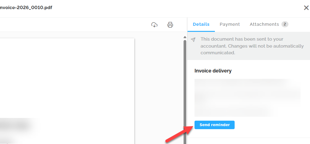 If the delivery failed you can manually trigger the delivery again. Click the 'Send reminder' button in the invoice.