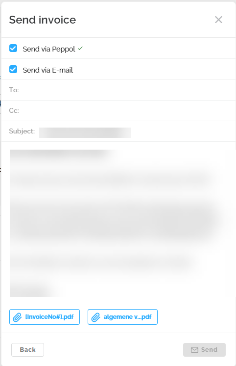 - You can disable the 'Email' option to send the invoice exclusively via Peppol. In this case, no accompanying email text will be sent.