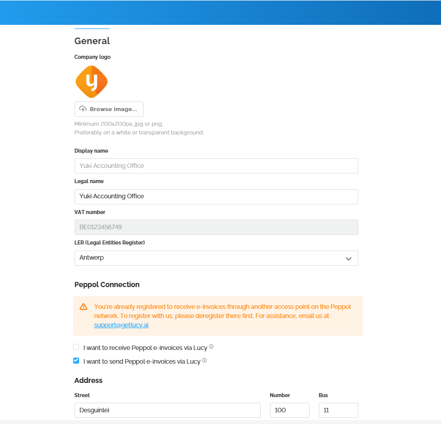 Under the ‘General’ tab, you have the option to add a logo to your Lucy environment, activate Peppol, and update your office address.