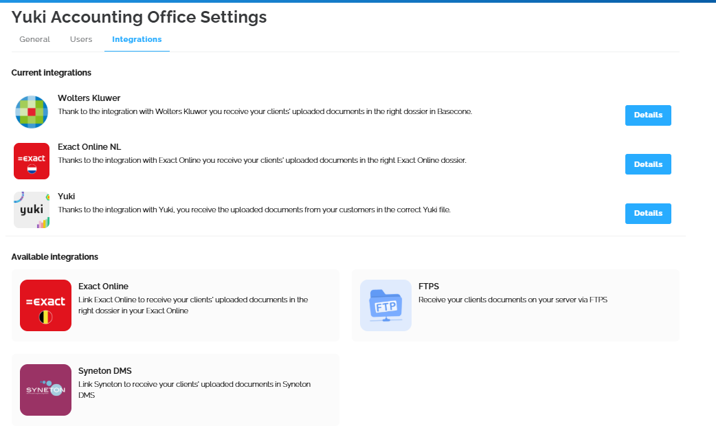 The existing integrations are: Wolters Kluwer, Exact Online, Exact Online NL, FTPS, Syneton DMS, and Yuki.