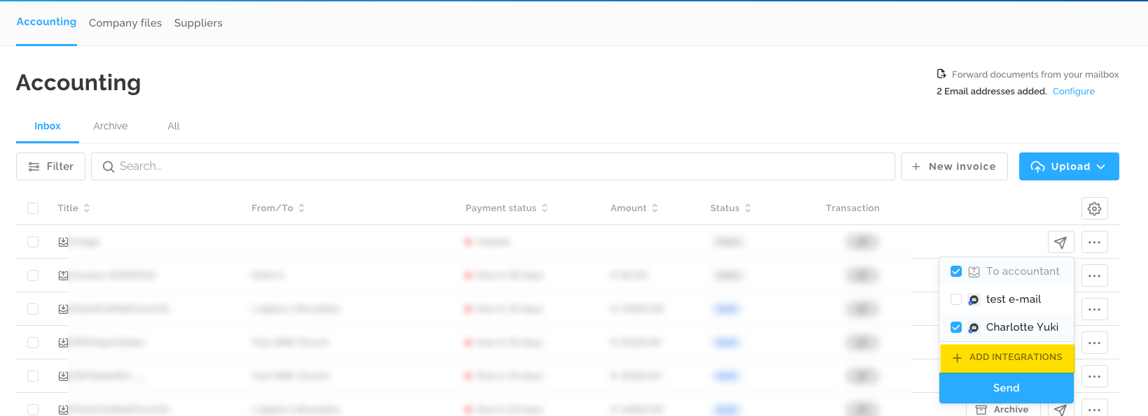 - The entrepreneur can choose from all their configured destinations. The accountant is a separate integration and is automatically checked if the document has not yet been forwarded. This option disappears automatically once the document has been sent.