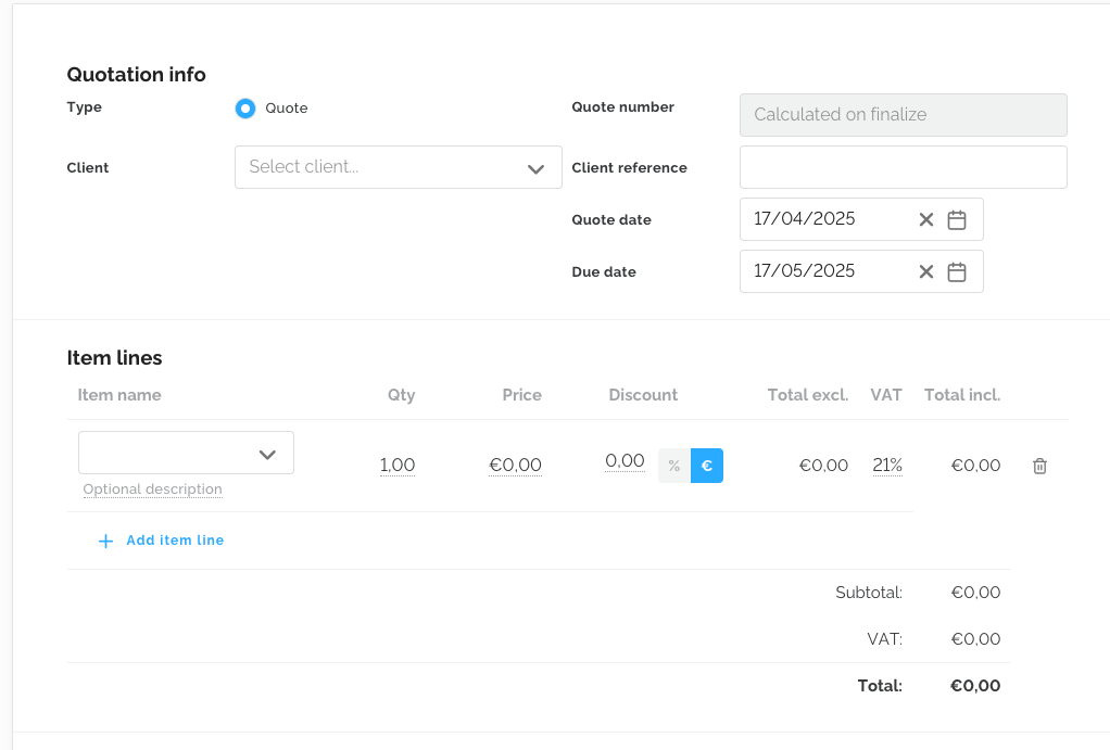 Click the + New quote button. Then, fill in the required fields. Before creating quotes, you can set the numbering format and the email template via the settings.