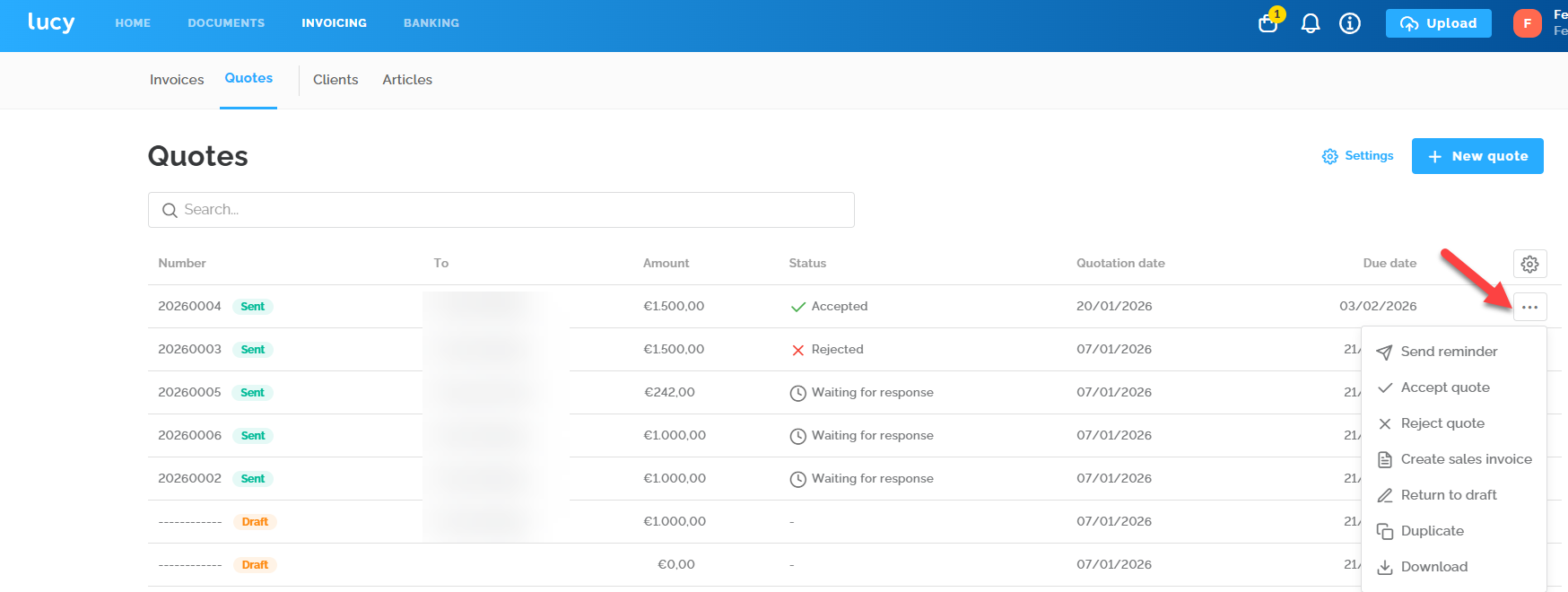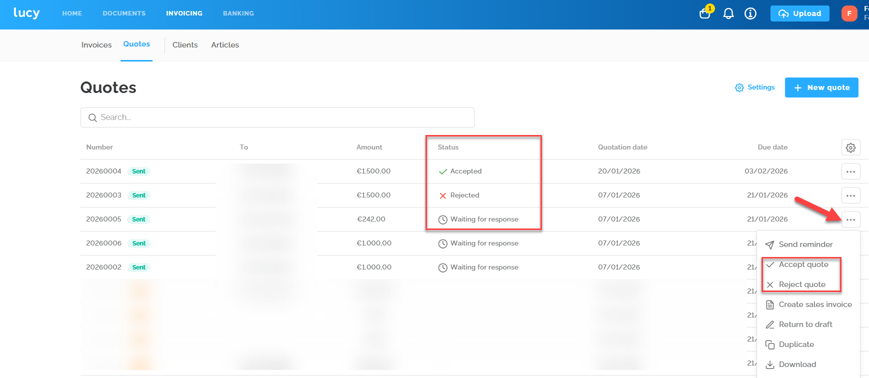 In the quote overview, you can see the status of each quote. Once a quote has been created, it will have the status "Open". By clicking on the three dots next to the quote, you can choose to accept or reject it. This always needs to be adjusted manually in the software.