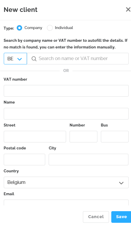 By clicking on the ‘Create new customer’ option, a window opens where you can manually add customers by searching by name or VAT number. Lucy will then automatically fill in the remaining fields. You can choose between ‘Company’ or ‘Individual’.