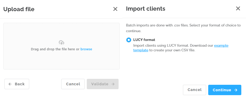 Importing customers can be done using a standard CSV format. Select the ‘Import customers’ option and then click ‘Sample template’ to download the file. By clicking the ‘Next’ button, you will be able to upload the file.