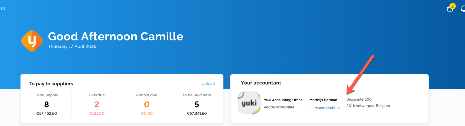 - The Contact role is considered an “extra” role. With this role, the accountant’s contact information is displayed to the entrepreneur in the field shown below. If you, as an accountant, do not want the entrepreneur to see your contact details, it is best to disable this role.