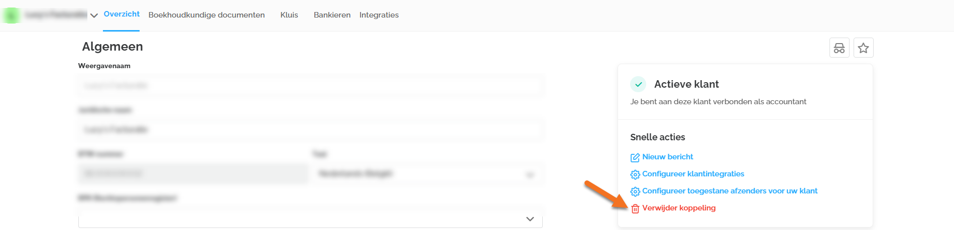 - To remove a customer from your customer list, go to the customer’s General Overview and click on ‘Remove Link’. This will unlink the customer’s file from your portal and remove the integration with the accounting software. The user will also be removed from the file and the plan will be canceled.