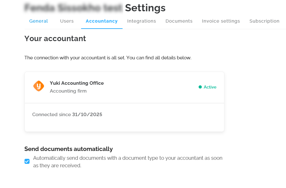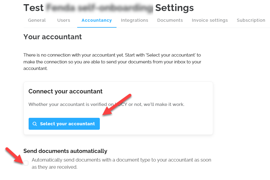 If you have registered your company yourself via Self-onboarding, you can select your accountant here. If you are not working with an accountant, you can set your own company as the accountant. This is essential to ensure that documents are automatically forwarded to your accounting integration, provided you have enabled this option.