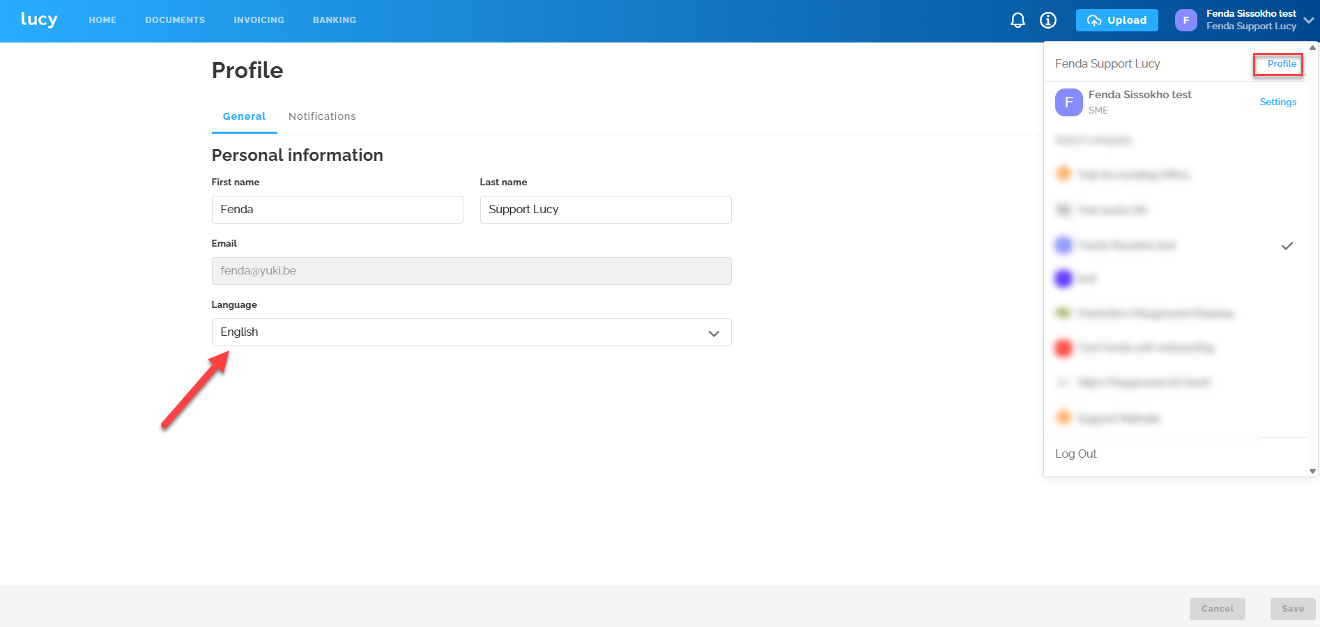 Through Profile, you can set the language in which you want to work with Lucy. However, this setting does not determine the language used for the invoices created in Lucy. The language of the invoices is determined by the language set for your customer.