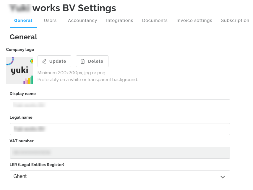 Under the 'General' tab, you can add a logo to your Lucy environment. This logo can be replaced or removed at any time. Additionally, you have the option to set or adjust the display name and legal name as needed. The VAT number cannot be changed or removed; for modifications, please contact the support team. At the bottom of this tab, you can also find your company's address details.