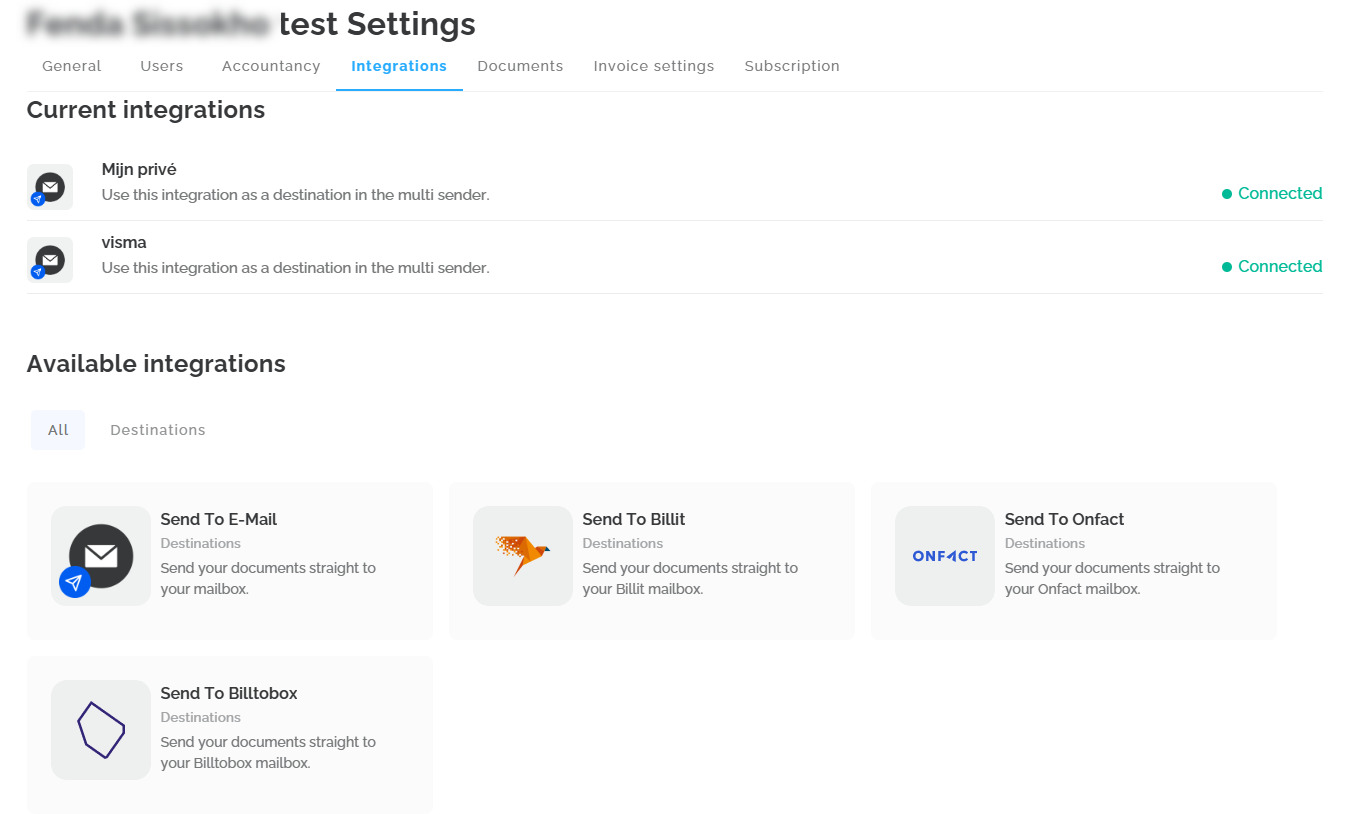 Under the 'Integrations' tab, you can connect to your private email address or another package. These destinations automatically appear in the multisender. The available integrations with accounting packages are not visible to entrepreneurs whose files are registered by the accountant in Lucy. This is because the accountant is responsible for setting up the integration with your accounting package.