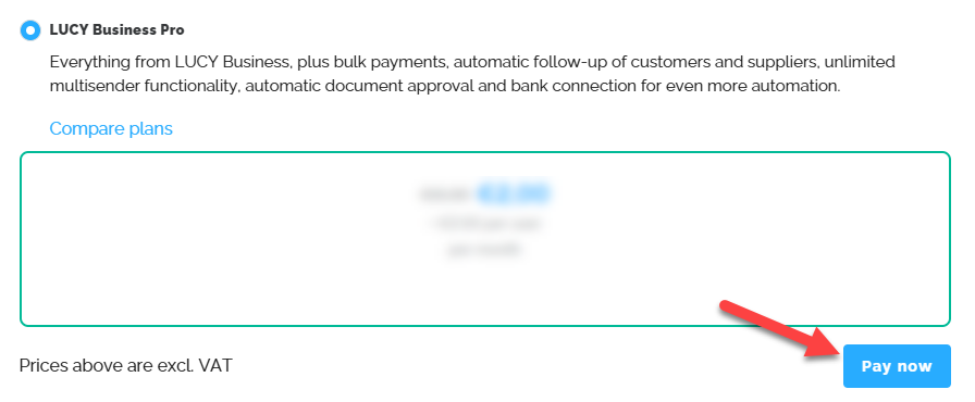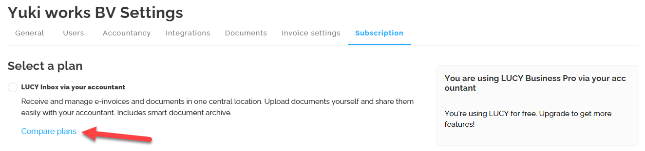 Finally, under the 'Subscription' tab, you can choose your Lucy plan. The different Lucy subscriptions are as follows: Lucy Inbox (not available through Self-onboarding), Lucy Invoicing, Lucy Business & Lucy Business Pro.