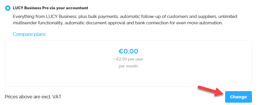 If your accountant pays for your plan, you can select the desired plan via the 'Change' button.