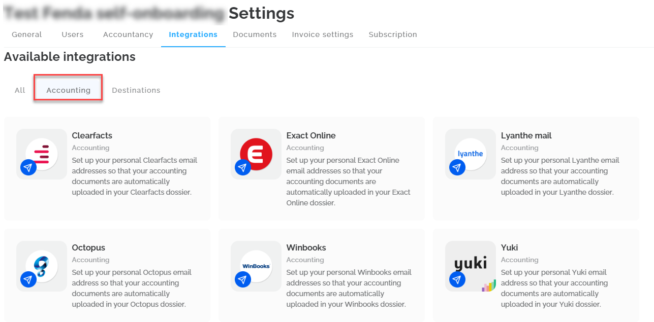 If you have registered your company through Self-onboarding, the available integrations with accounting packages will also be visible. In this overview, you can see the available integrations, which you can click on to find more information and the necessary steps.These are the existing integrations: Clearfacts, Exact Online, Lyanthe email, Octopus, Winbooks, Exact Online NL, FTPS, Yuki, Wings, Zenvoices.