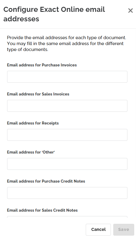 This integration uses EOL's functionality to receive specific documents via dedicated email addresses. You must retrieve the correct email addresses from EOL and paste them here.