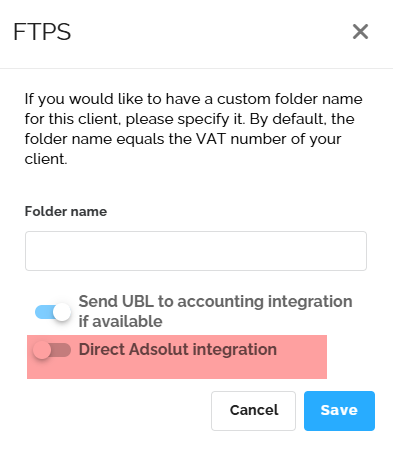Changing the name of this folder afterwards is possible, but it causes clutter and often leads to confusion when interpreting the data on the local server at your office. If you still want to change it, it is recommended to break the connection at the dossier level and reconnect with the correct name.The 'Direct Adsolut integration' switch must ONLY be on if you are integrating with Adsolut. The link will NOT work if this setting is incorrect.