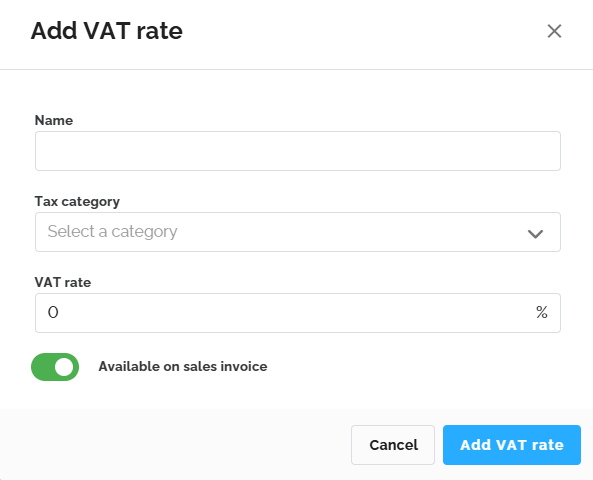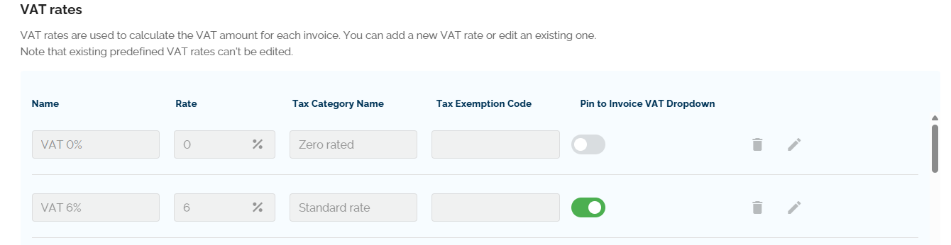 - Toggle: Use this switch to determine if this VAT rate should be immediately available when creating an invoice.