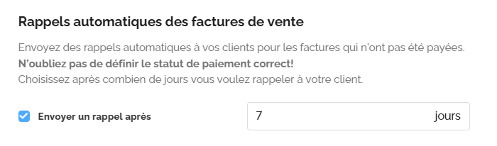 Important : Assurez-vous que les champs suivants sont remplis, car ils sont obligatoires: - IBAN - numérotation des factures - l'adresse email où les clients peuvent répondre. Si ces champs ne sont pas remplis, les paramètres ne peuvent pas être enregistrés.