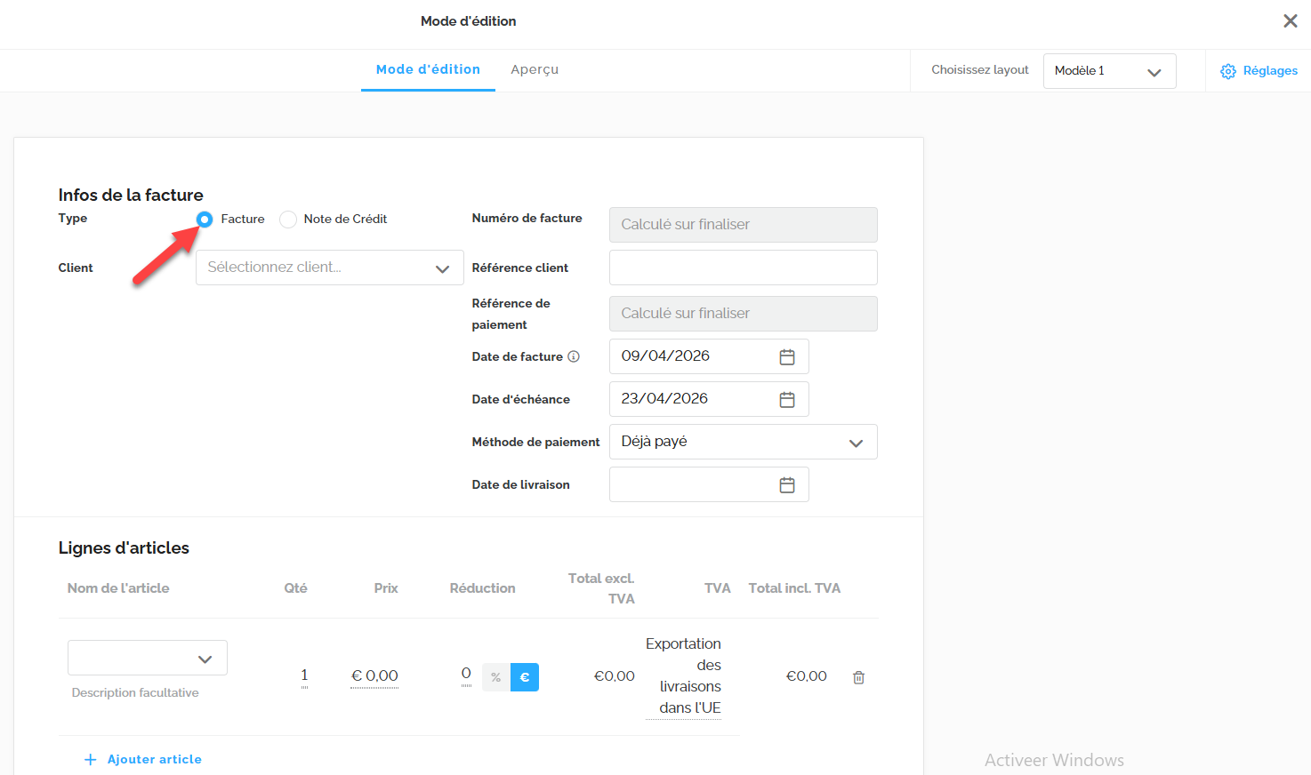 Dans la section Lignes d'articles, vous pouvez ensuite ajouter vos articles à votre facture: