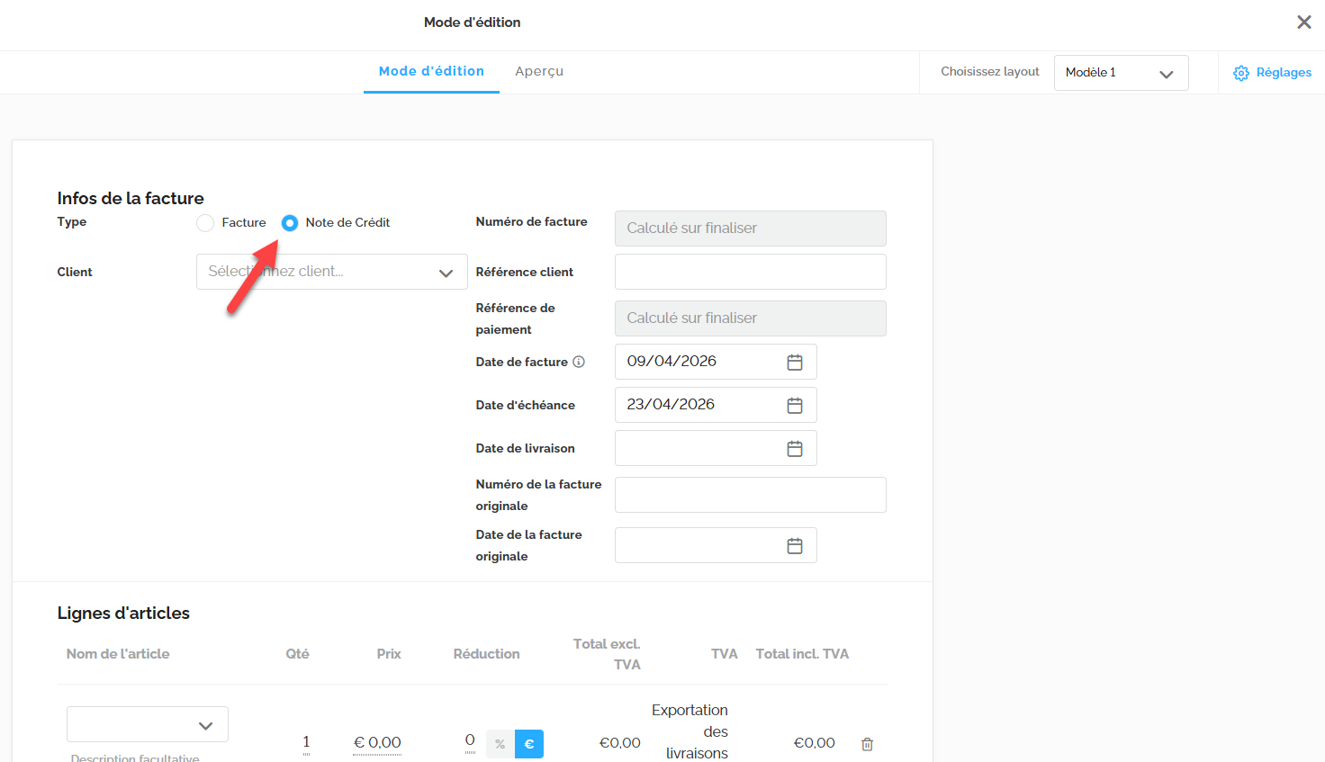 - Dans le menu déroulant, choisissez le type « Note de crédit ».