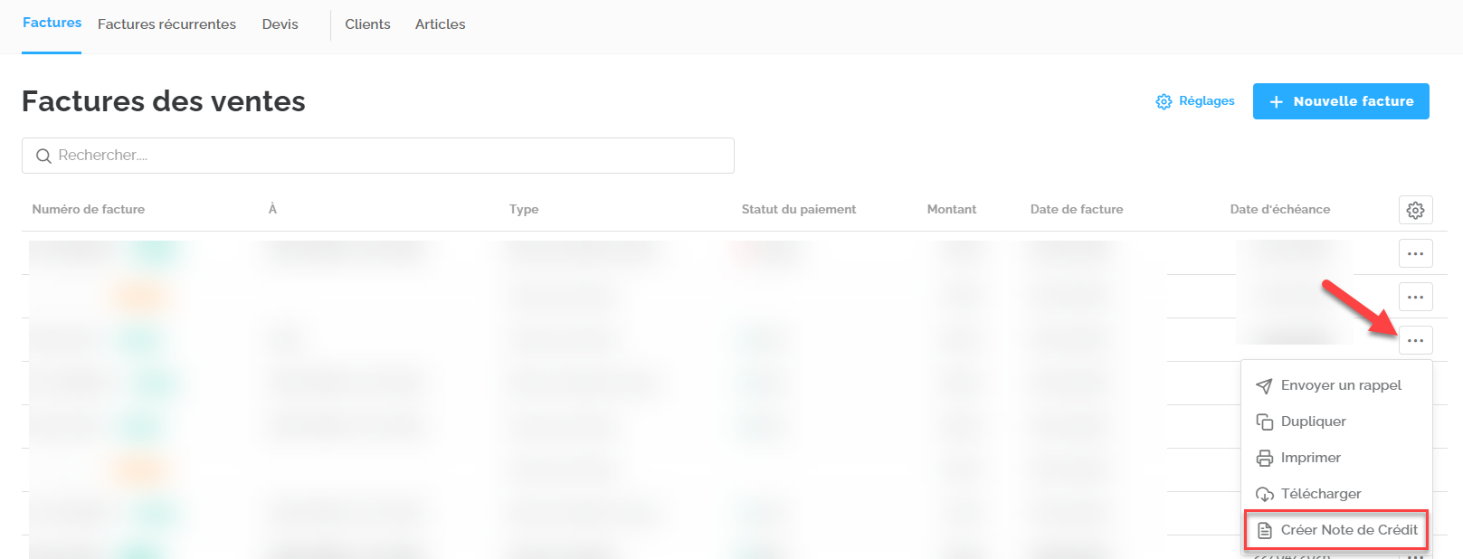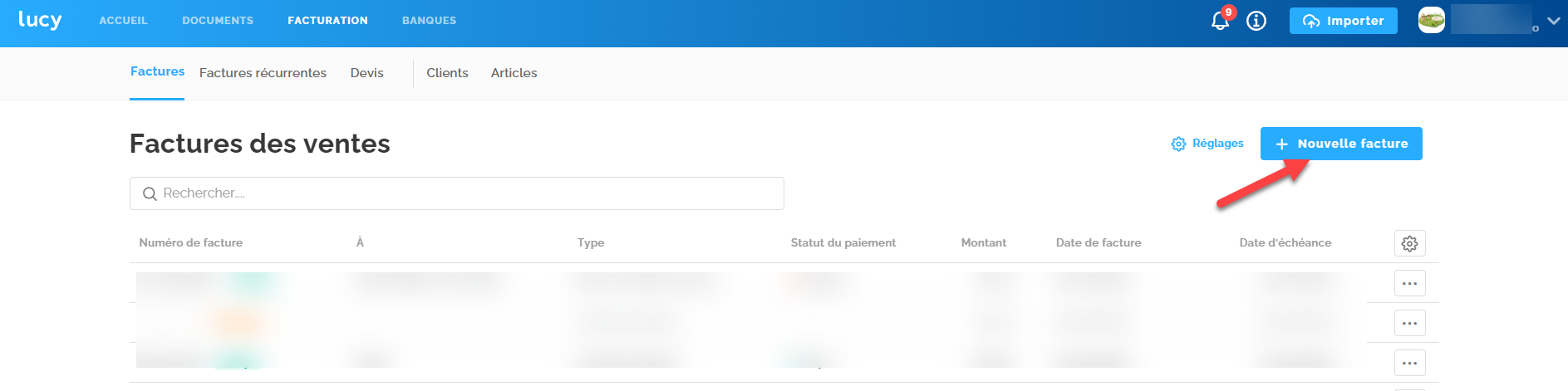 - Cliquez sur le bouton + Nouvelle facture.
