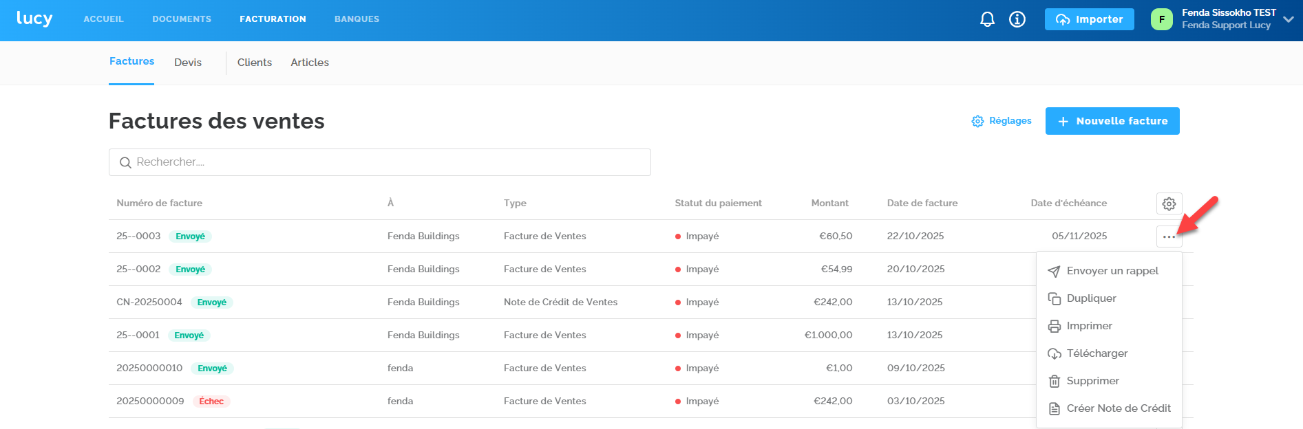 Important à noter : Dans Lucy, il n'est pas possible de créer des factures de test, même pendant la période d'essai. Créer une facture de vente