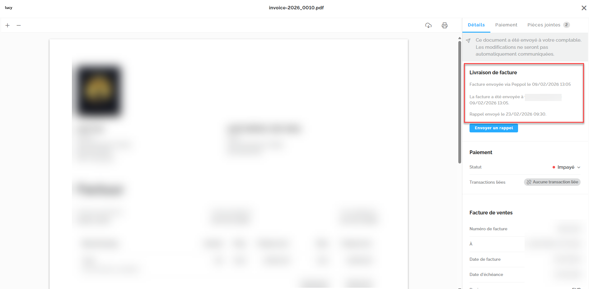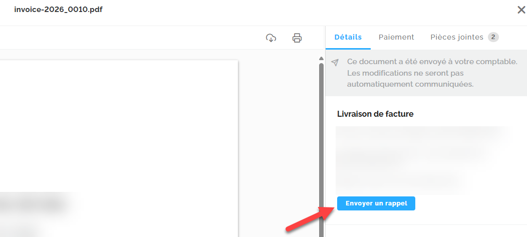 Si l'envoi échoue, vous pouvez déclencher manuellement un nouvel envoi. Dans la facture, cliquez sur le bouton « Envoyer un rappel ».