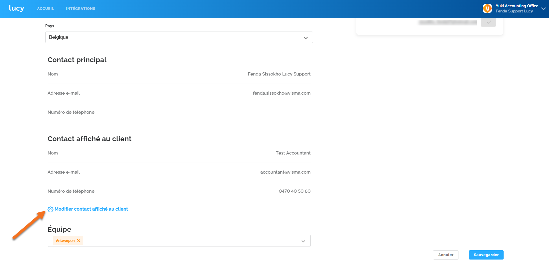 Pour afficher le bon contact de votre bureau dans le dossier client, vous pouvez compléter le champ 'Contact affiché au client' en utilisant l'option "Modifier contact affiché au client". Actuellement, les coordonnées de l'entrepreneur sont affichées dans ce champ, mais cela sera bientôt ajusté dans le logiciel.