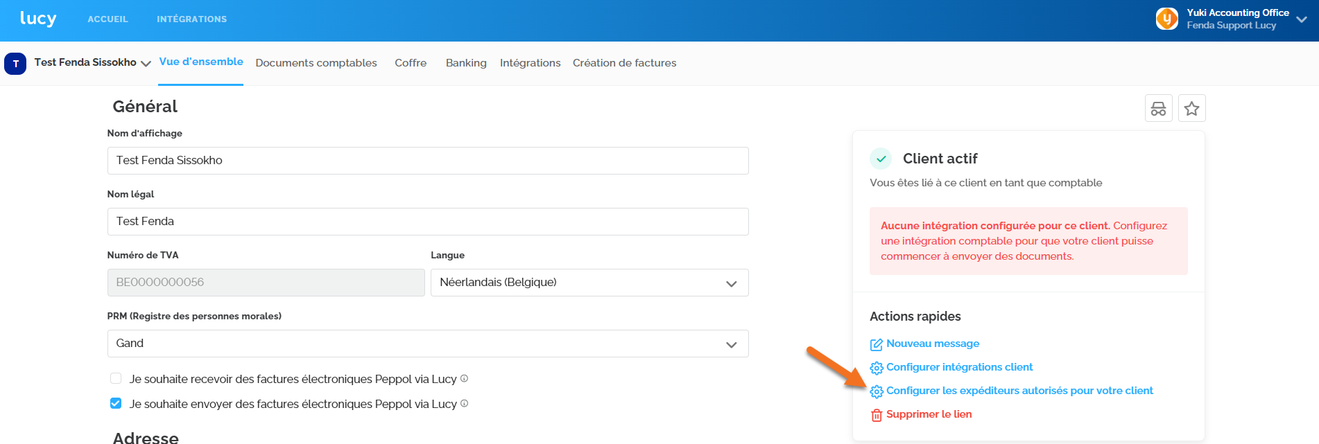 De plus, vous pouvez utiliser le bouton 'Configurer les expéditeur autorisés pour votre client' pour placer les adresses e-mail des fournisseurs du client sur la liste blanche, afin que leurs e-mails arrivent dans la boîte de réception Lucy.