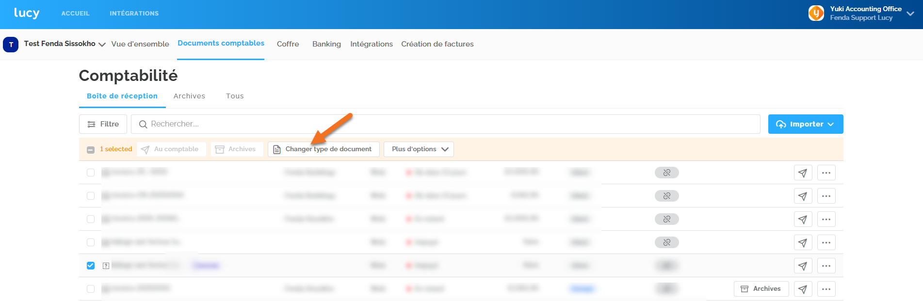 - En tant que comptable, vous avez la possibilité d'assigner le bon type à un document depuis l'aperçu 'Documents comptables'. Vous pouvez sélectionner le document et effectuer la modification via le bouton 'Changer type de document'.