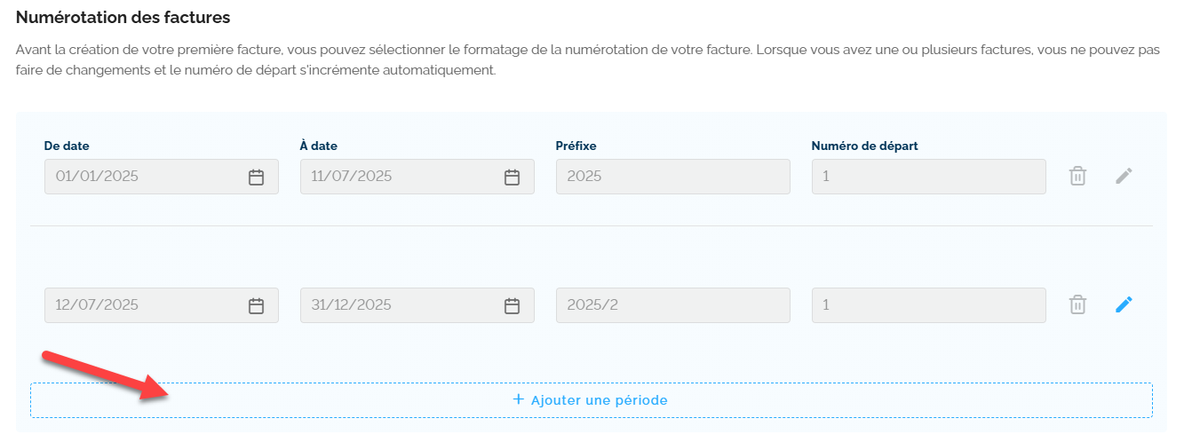 - Si vous souhaitez modifier la numérotation des factures, vous pouvez créer une nouvelle période avec la numérotation souhaitée via les paramètres des factures de vente. Une fois qu'une facture a été créée, la numérotation ne peut plus être modifié.