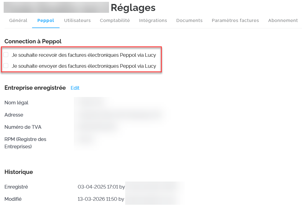 Vous pouvez désinscrire votre entreprise du réseau Peppol à tout moment via Lucy en décochant les cases.