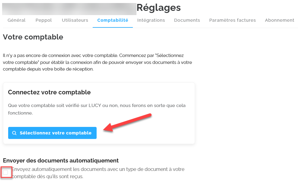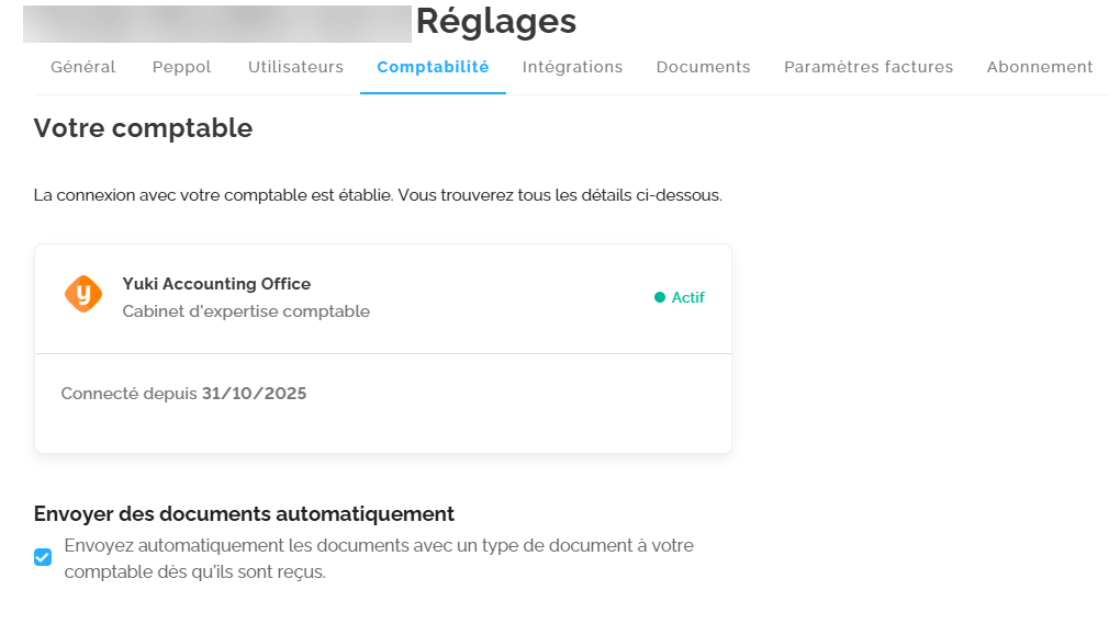 Sous l'onglet Comptabilité, vous pouvez vérifier si la connexion avec votre comptable est correcte et depuis quand elle est active. Si votre comptable a enregistré votre dossier dans Lucy, ces données sont automatiquement remplies. En activant l'option 'Envoyer des documents automatiquement', tous les documents dans votre boîte de réception seront automatiquement transférés à votre logiciel de comptabilité.
