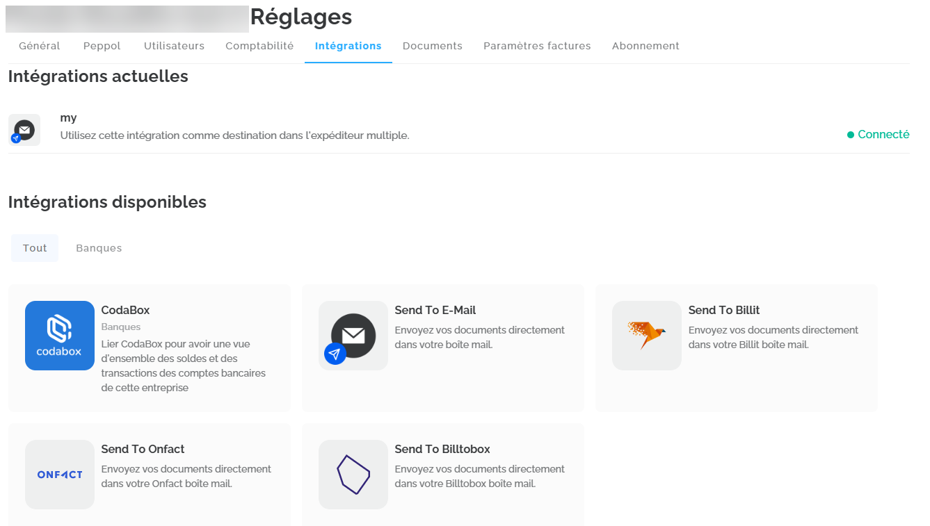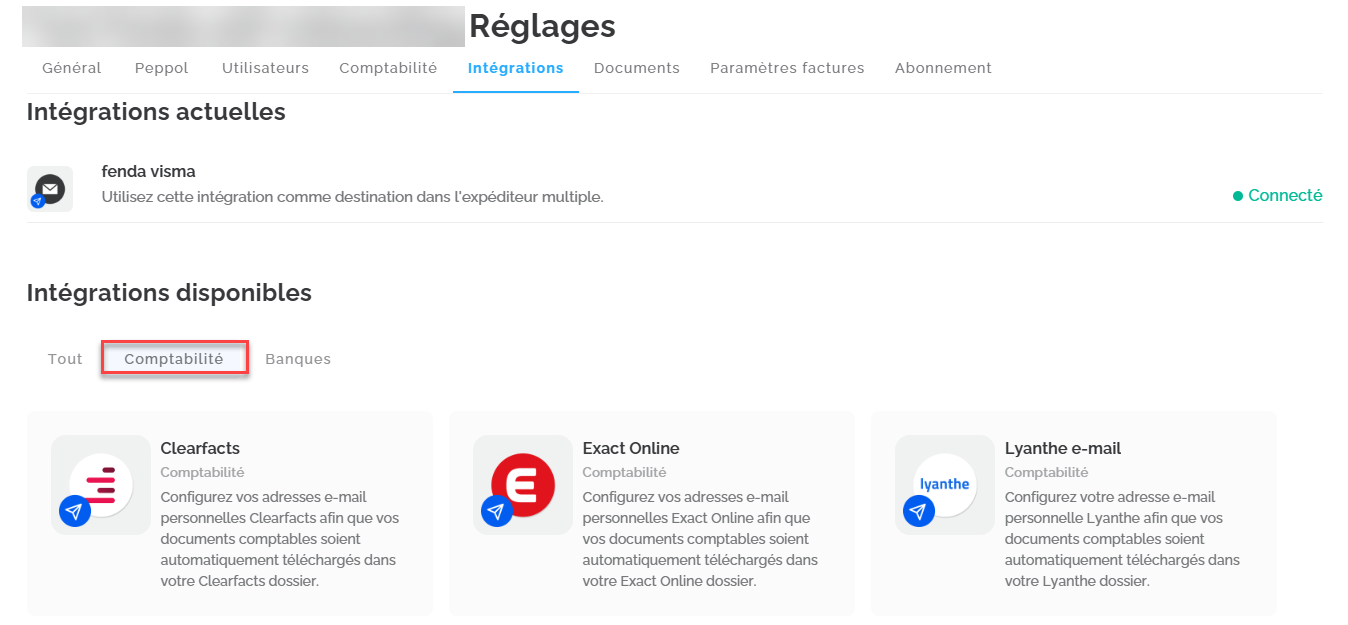 Voici les intégrations existantes : Clearfacts, Exact Online, Lyanthe e-mail, Octopus, Winbooks, Exact Online NL, FTPS, Yuki, Wings, Zenvoices.