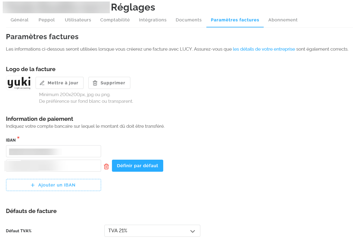 Dans l'onglet Paramètres factures, vous avez la possibilité de renseigner des informations générales concernant l'élaboration de vos factures de vente. Vous y trouverez les éléments suivants : le logo de la facture, le numéro IBAN, les valeurs par défaut, les informations supplémentaires (site web, e-mail, numéro de téléphone), les conditions générales et le modèle d'e-mail. En bas de cet onglet, vous pouvez activer le rappel automatique.