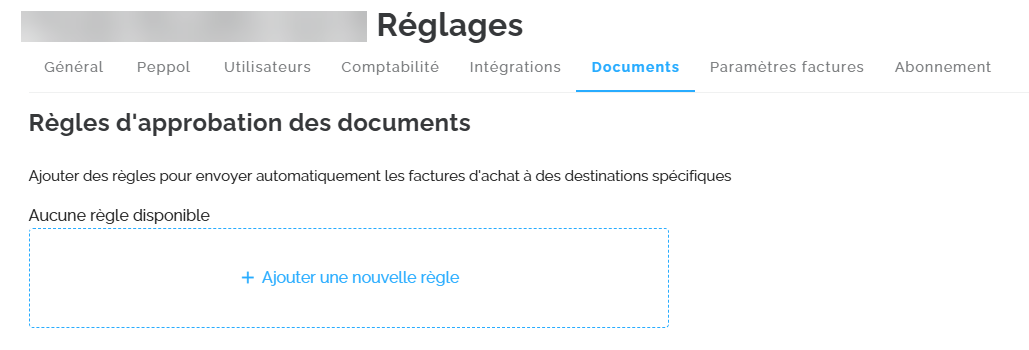 Dans l'onglet Documents, vous pouvez ajouter des règles pour l'envoi automatique de factures d'achat vers des destinations spécifiques.