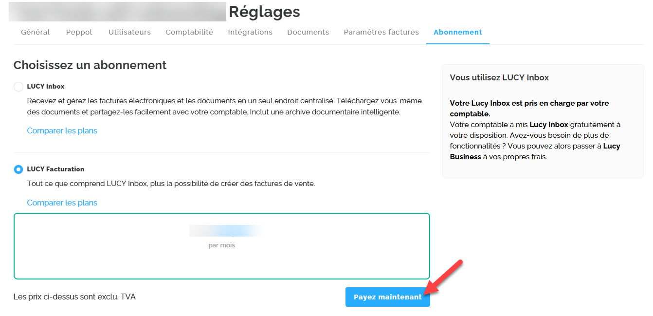 Enfin, dans l'onglet Abonnement, vous pouvez choisir votre plan Lucy. Les différents abonnements Lucy sont les suivants : Lucy Inbox (non disponible via le Self-onboarding), Lucy Facturation, Lucy Business & Lucy Business Pro.